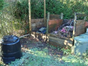 Compost corner -The black food compost bin on the left, piles of garden compost in the wood bins and green bins of ready-to-use compost on the right.