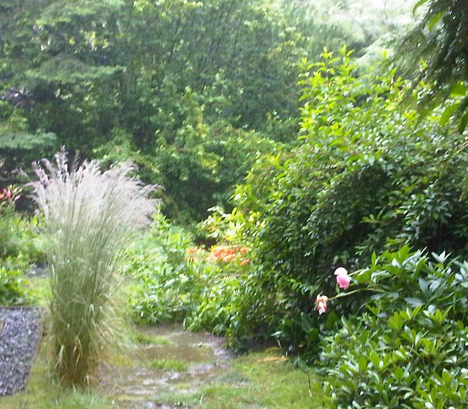 Because yesterday was supposed to be the last day of rain for awhile, I decided to pump water into the barrels at the back of the yard. We not only have a large rain barrel that collects from the roof, but several huge barrels at the back of the yard to store rainwater for the garden. When I went outside it started to rain heavily. I started to pump and then watched the rain sluice into the rain barrel.