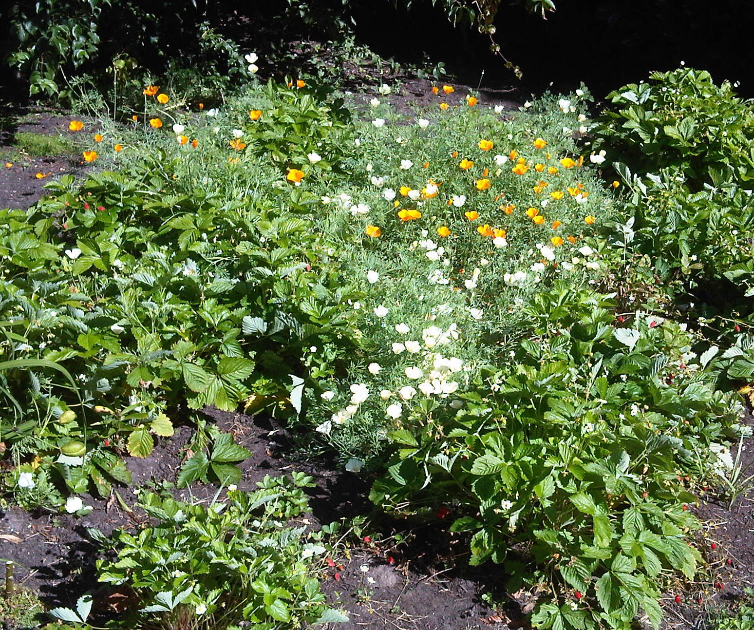 This year the strawberries have been particularly productive. Note that half of the the plants in the front yard produce albino berries and seem sweeter than the red ones. One reason for the high productivity this year may be due to the fact that the berries are located near California poppies, which attract a lot of bees. Interestingly enough, about half of the poppies in the front of the yard are also albinos.