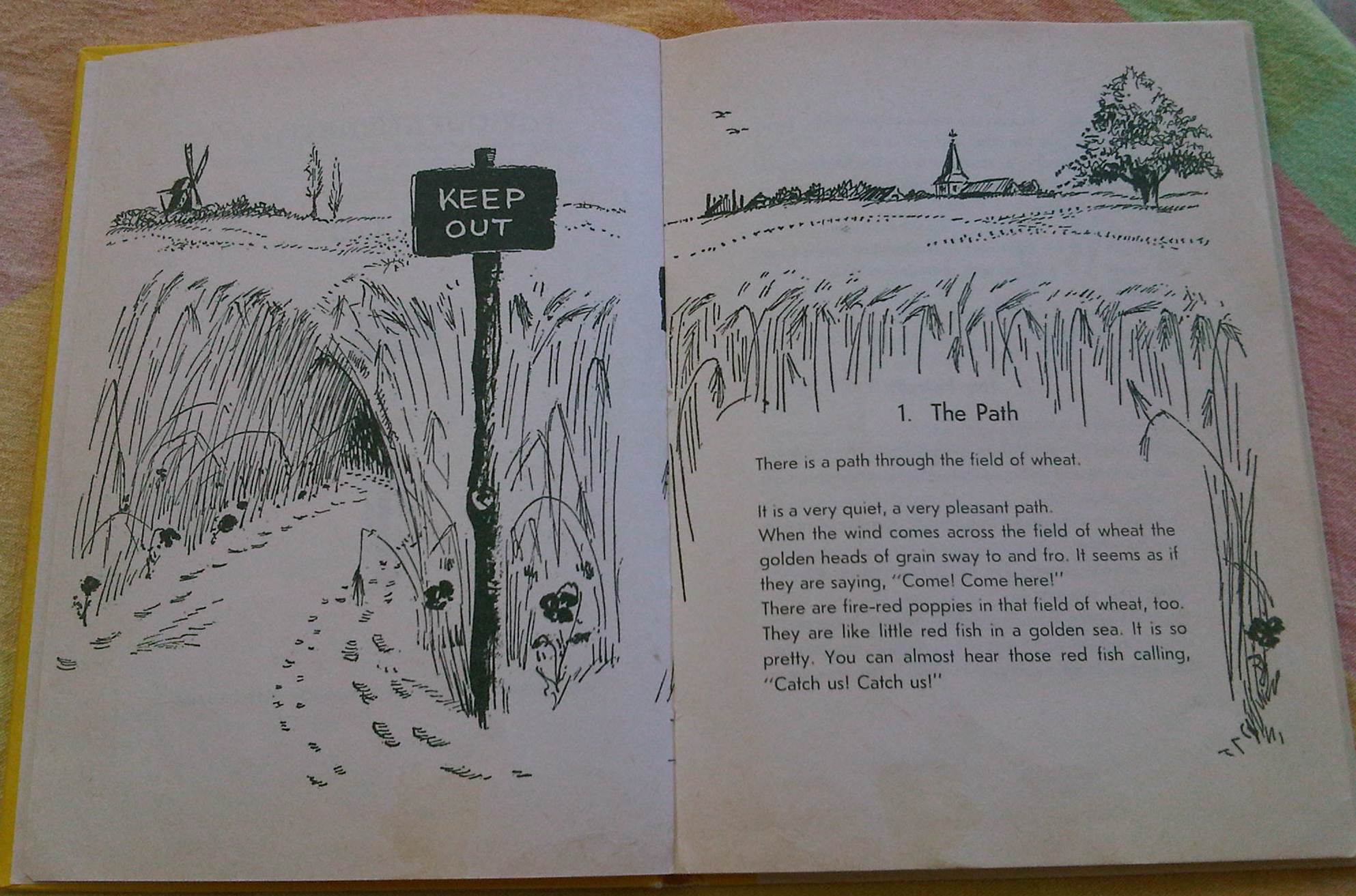 I love poppies. One of my favorite childhood books was “Keep Out”, written and illustrated by W.G. van de Hulst. This story, translated from Dutch, is about Ruth, Sally and Sally’s dog, Tippy. Ignoring the “keep out” sign, the little girls they enter a wheat field to pick red poppies, and in the process trample the valuable wheat. Farmers, police and parents all get involved, but everything works out in end and the little girls become friends.
