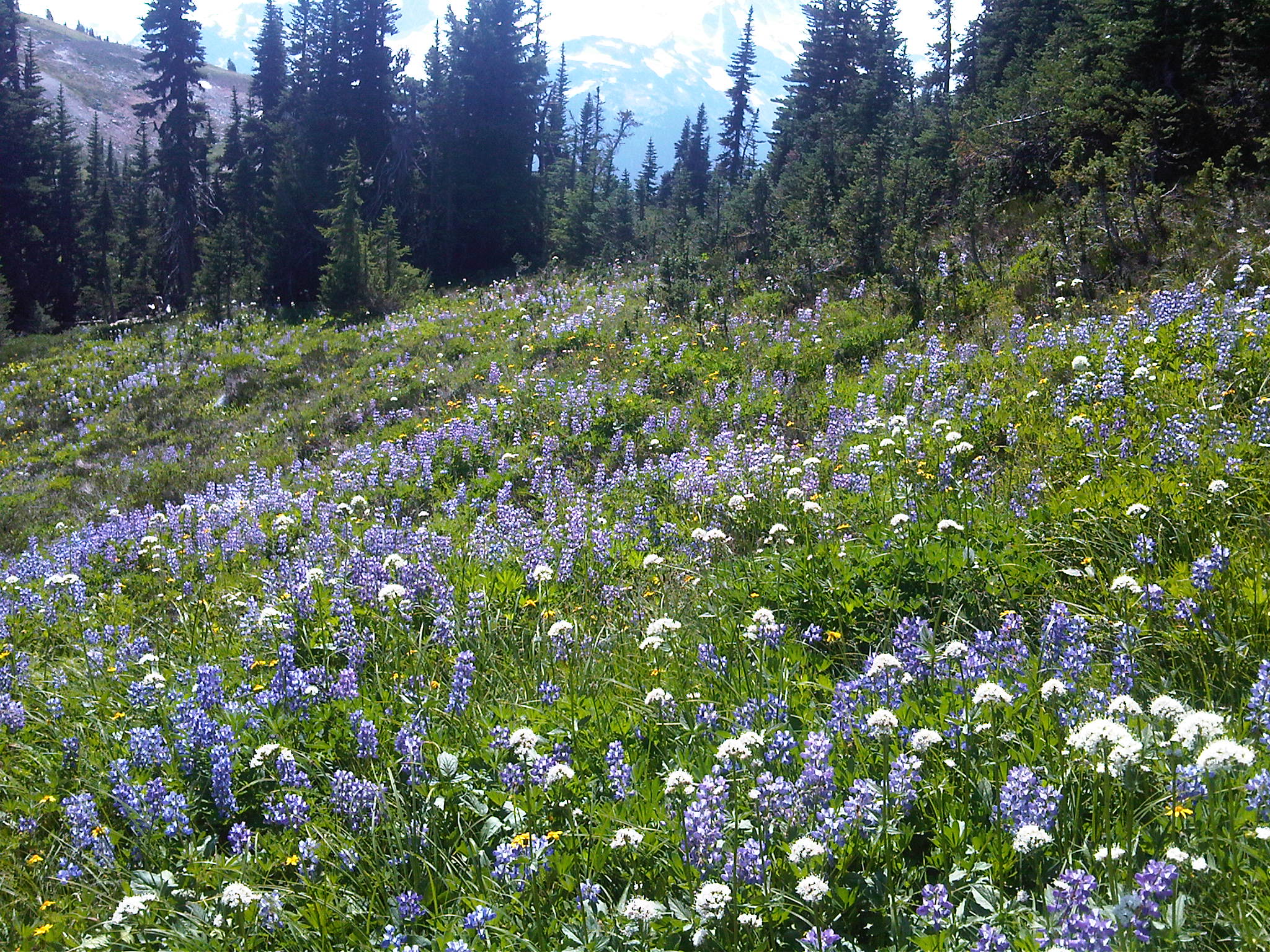 Our timing was perfect, as the alpine wildflowers are now in full bloom. The photo (above) doesn’t really do the flowers justice; each meadow we walked through featured different combinations and colors of flowers. The trail down from Singing Pass was also lined with many different blossoms, many of which are familiar to me because they used to grew in our garden.