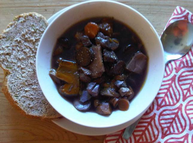Instead, of serving the vegetables for dinner, I chopped them up, tossed them into some really tasty chicken stock, and added thyme and leftover turkey breast. After simmering, I cooled the soup and let it rest in the fridge overnight. Just now I went to heat up some for lunch and was shocked to find everything tinted purplish grey. Grey carrots, grey parsnips, grey turkey and deep purple/grey broth. Looked awful, but tasted great: food to eat with your eyes closed.