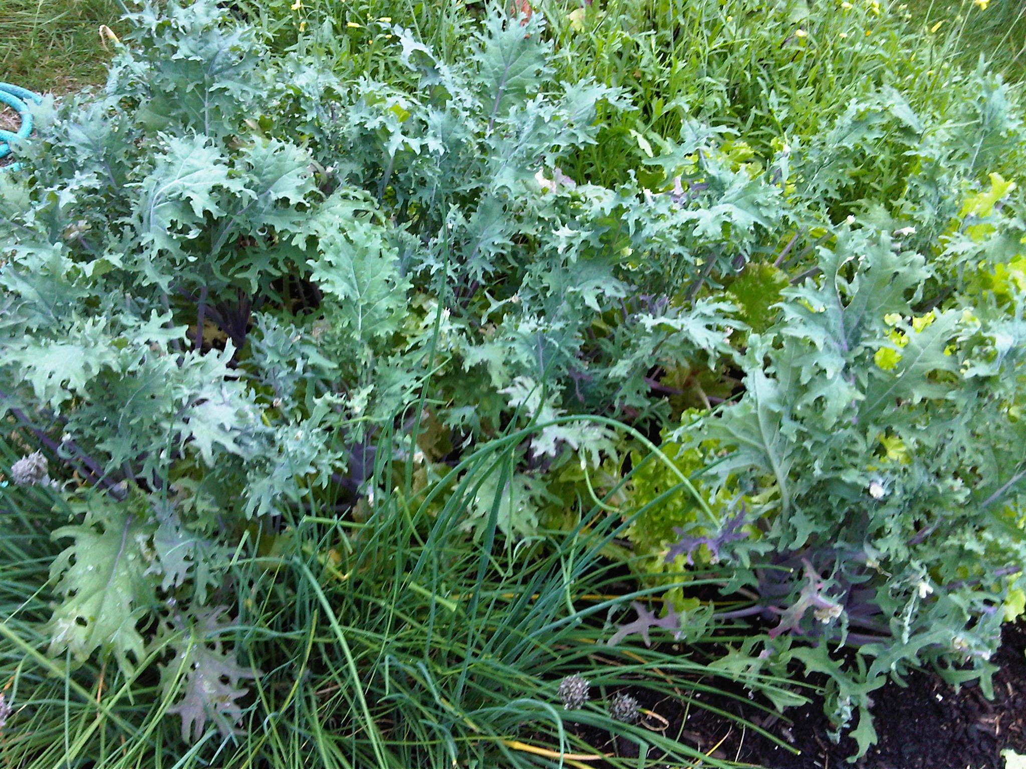 AFTER harvesting a huge bag of kale. The kale is shading out the chives and lettuce. The arugula in the background is shading out the beets.