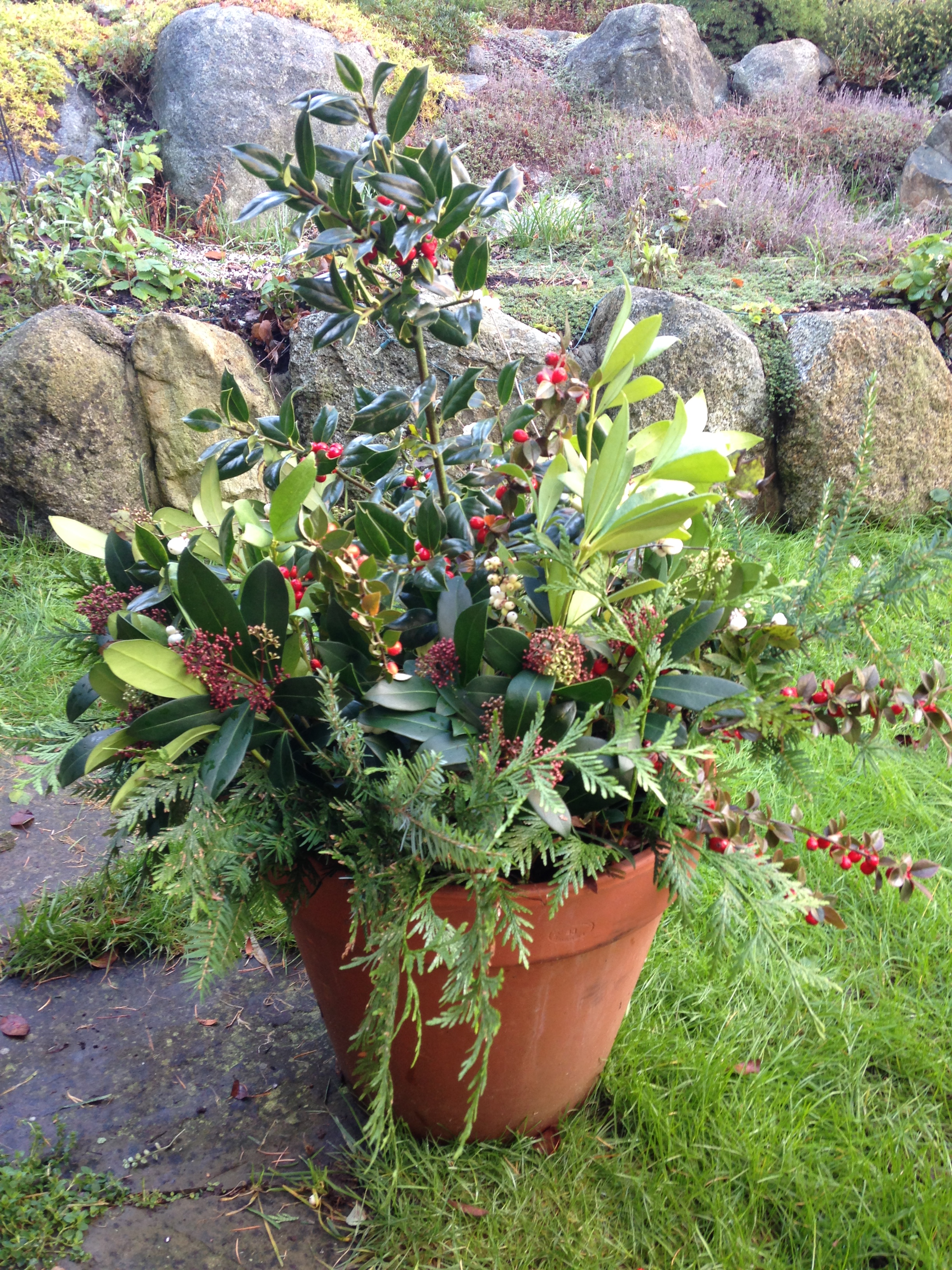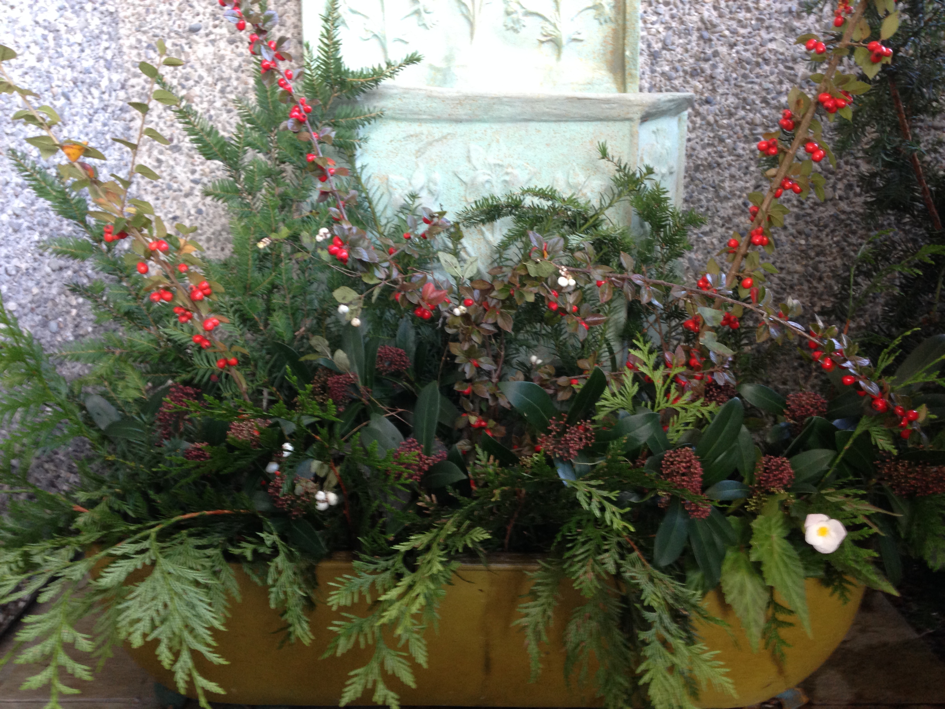 I put a few Forsythia branches inside to see if they will bloom, but the rest of those went into garden waste. The cedar branches and the pinkish sedum blossoms were used to give my planters the Christmas makeover along with greenery and berries from around the yard. For vertical interest I used a holly branch from my neighbors tree (thanks Brian and Sheila!) and branches of cotoneaster. November is still too early to completely xmasize, so I held off on adding the bows, ribbons and the iridescent sparkles until December.
