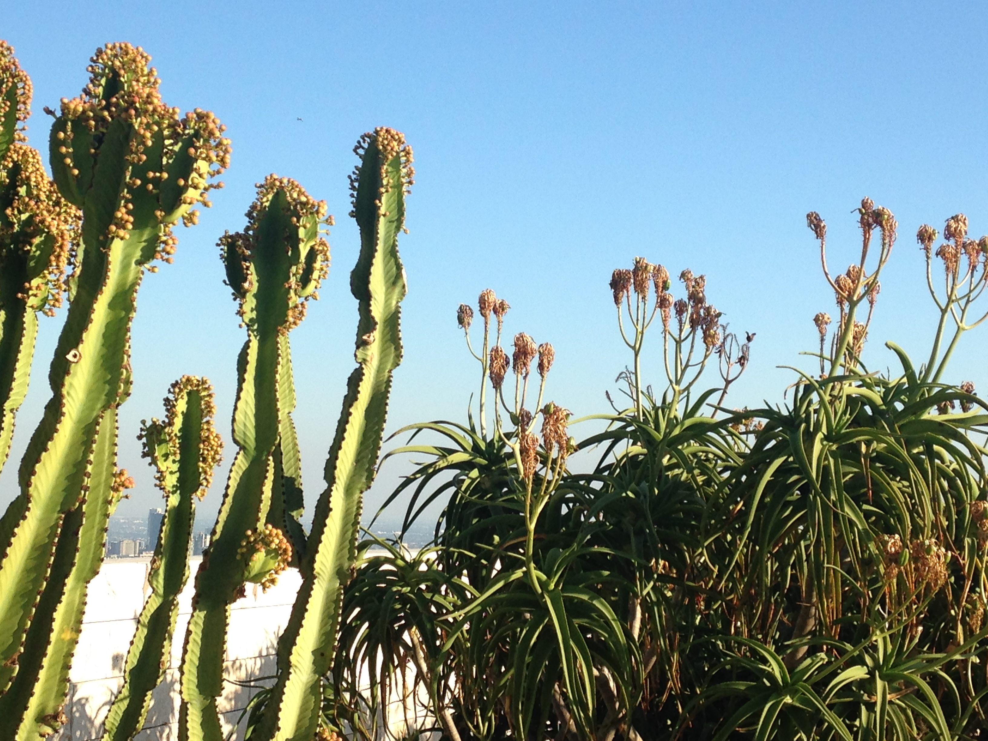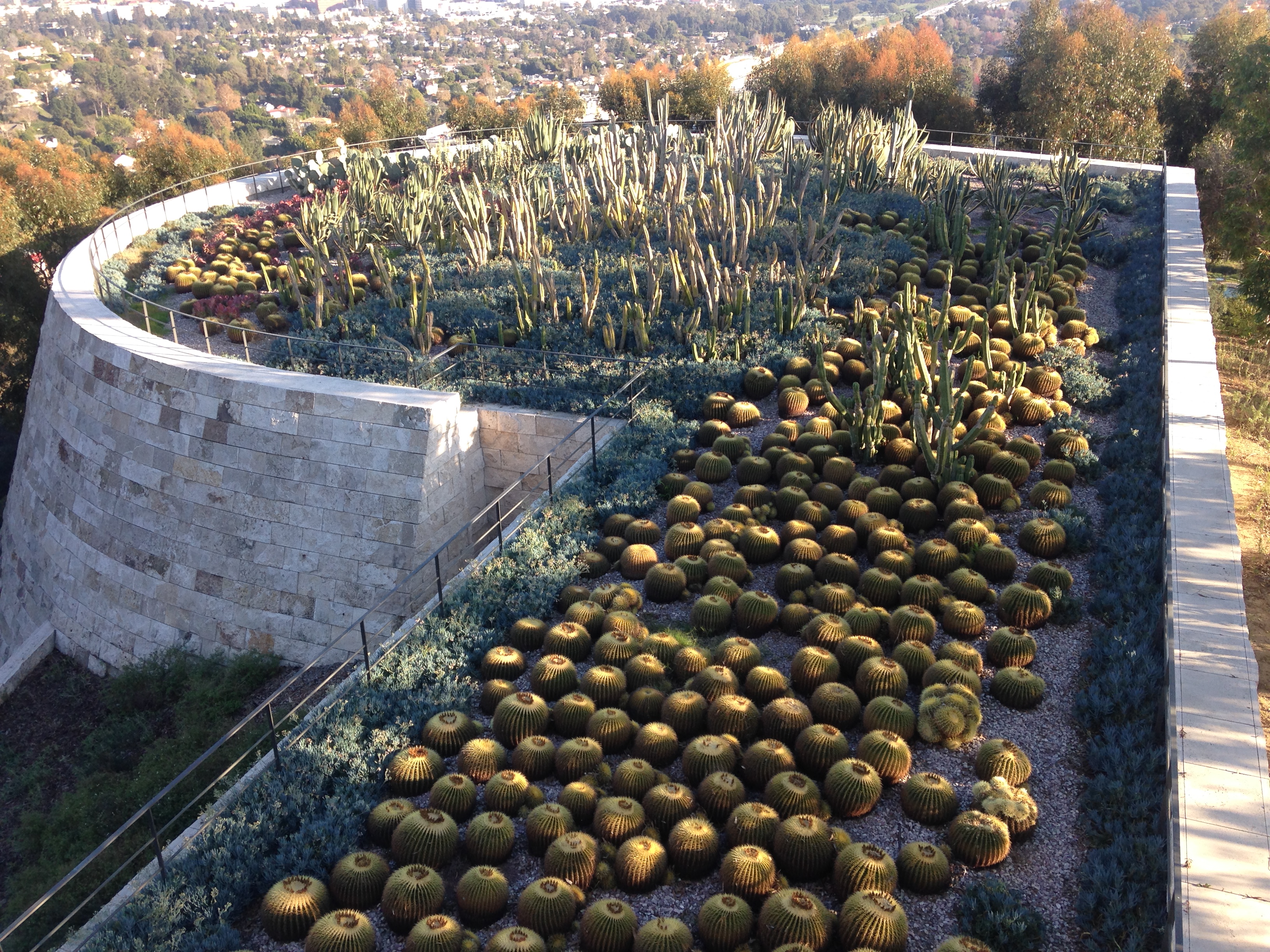 A highlight of the trip was an afternoon spent with The Man at the J. Paul Getty Museum. In addition to an enormous collection of art, the museum is surrounded by interesting gardens and has some amazing views of the city. By necessity, the plants that were selected for the gardens had to be hardy enough to survive and thrive in such a dry climate. The cactus terrace (above and below) was a favorite.