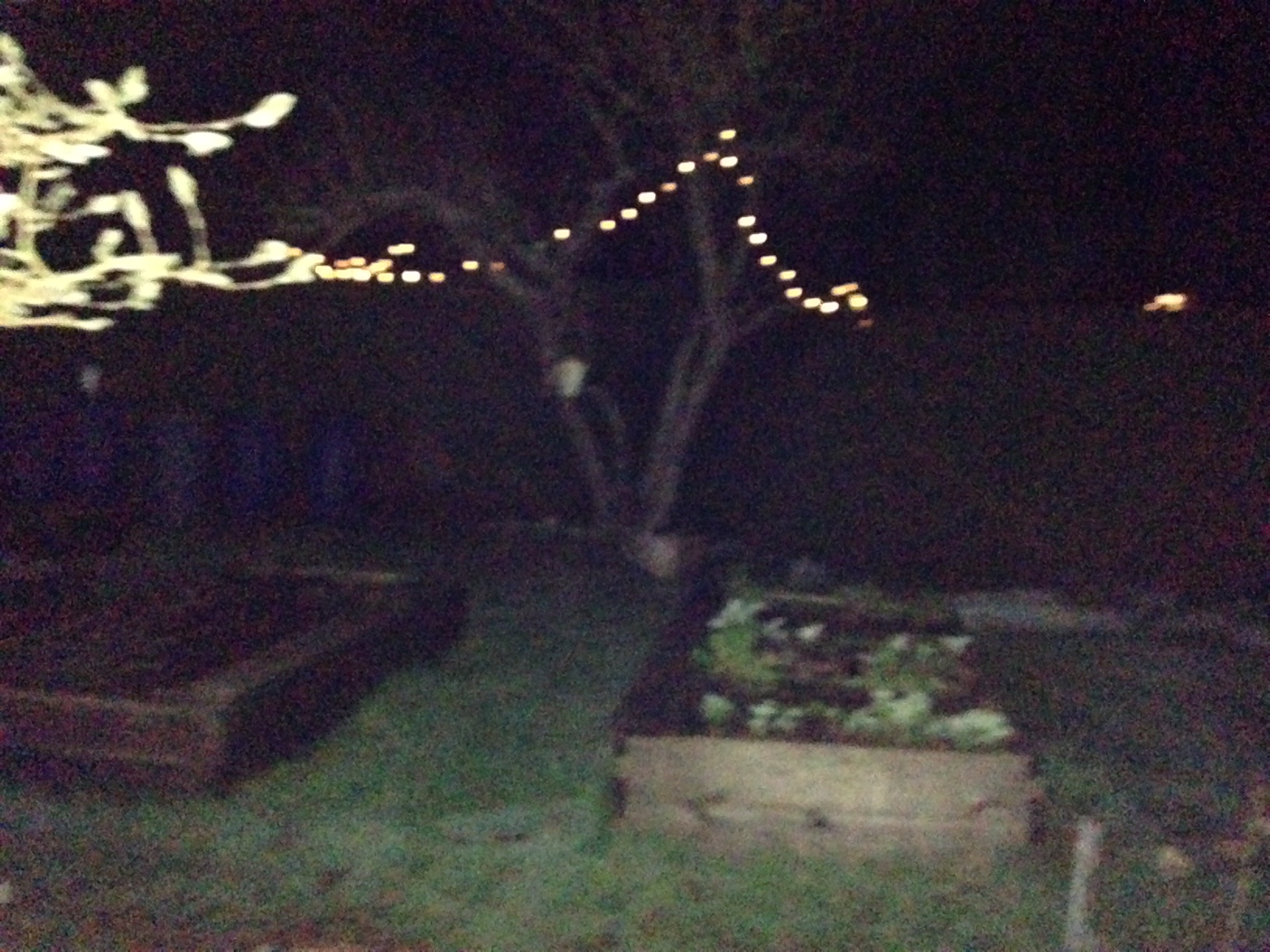 After spreading several more bags of manure around the peonies and filling in some holes in the front, I hit the wall of exhaustion and abandoned my original plan of a bike ride. Instead I sat under the apple tree for about an hour and couldn’t move. You can see the string of lights hanging in the tree. I can’t remember if I blogged about it or not, but I find my back garden super-creepy at night. A few years ago I tried to plant a “moon garden” thinking that all the white flowers would be visible and romantic in the moonlight, but if they are, I wouldn’t know. Last weekend I moved the solar LEDs from the deck to the tree, hoping to make the back garden more inviting at night. They look nice from the house, but they don’t make thinks any less creepy in the backyard. The bottom photo was taken as I was running back to the house….