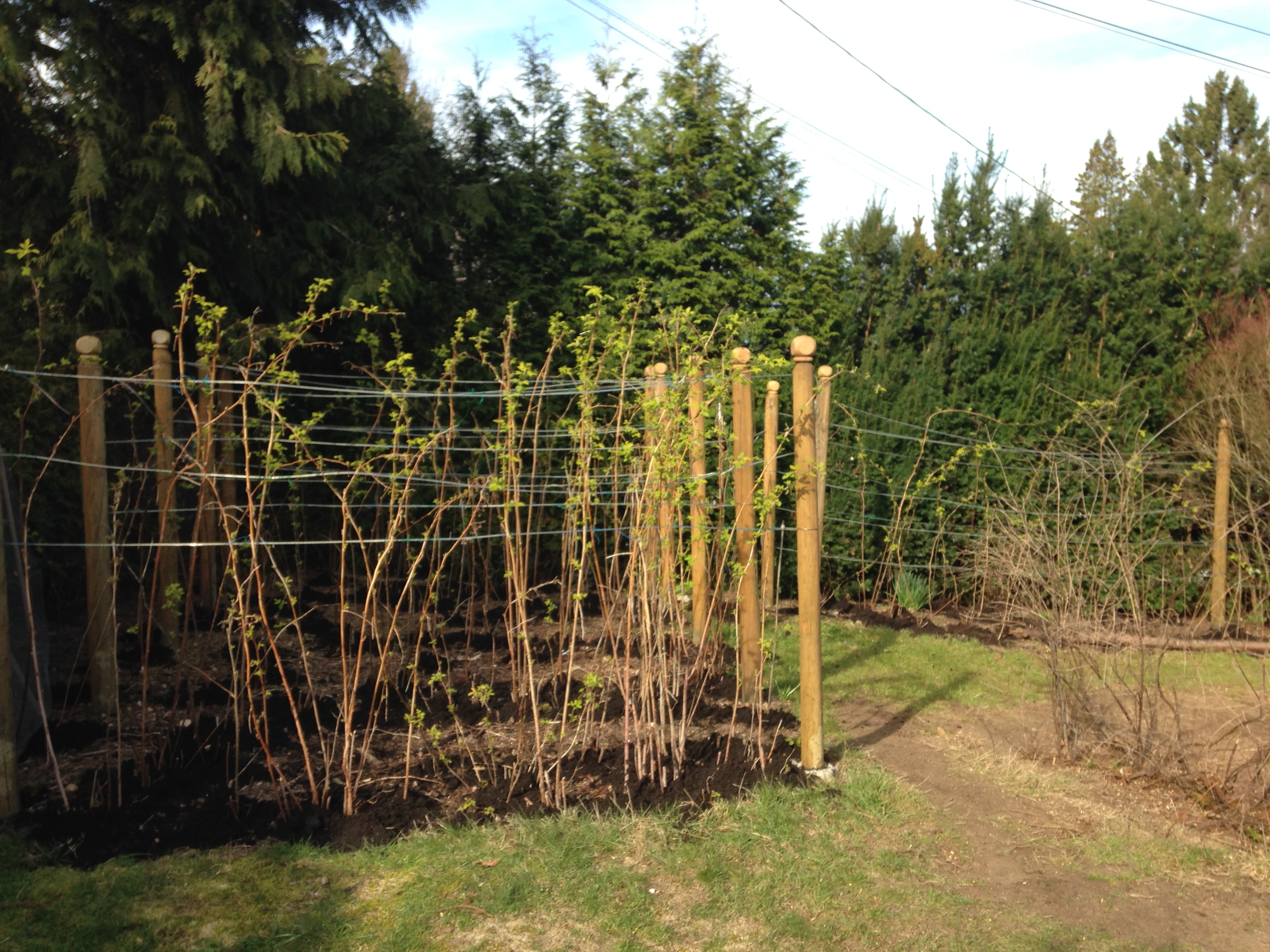 In addition to the raspberries and the fruit trees, I also top dressed the raised beds where the garlic and peas are growing. The garlic planted in October is up as are the first peas planted in February. Another row and a half of peas are planted in the ground next to the favas, but they haven’t come up yet. Although I was planning on succession planting this year (as my friend L3 always does), the entire pea pack fell into a bucket so I ended up having to plant them all. Two rows of favas were planted mid-February using some of the super huge beans harvested from last year’s crop. I also planted an additional 1.5 rows to the south, using “Windsor” variety seeds from West Coast Seeds. This head to head trial is being conducted to determine which seeds are most robust. The primary endpoint for this trial will be the final size of the harvested beans, while secondary endpoints will include the median height of the plants, size of the pods and overall yield per plant. (Ha ha – science nerd humour).