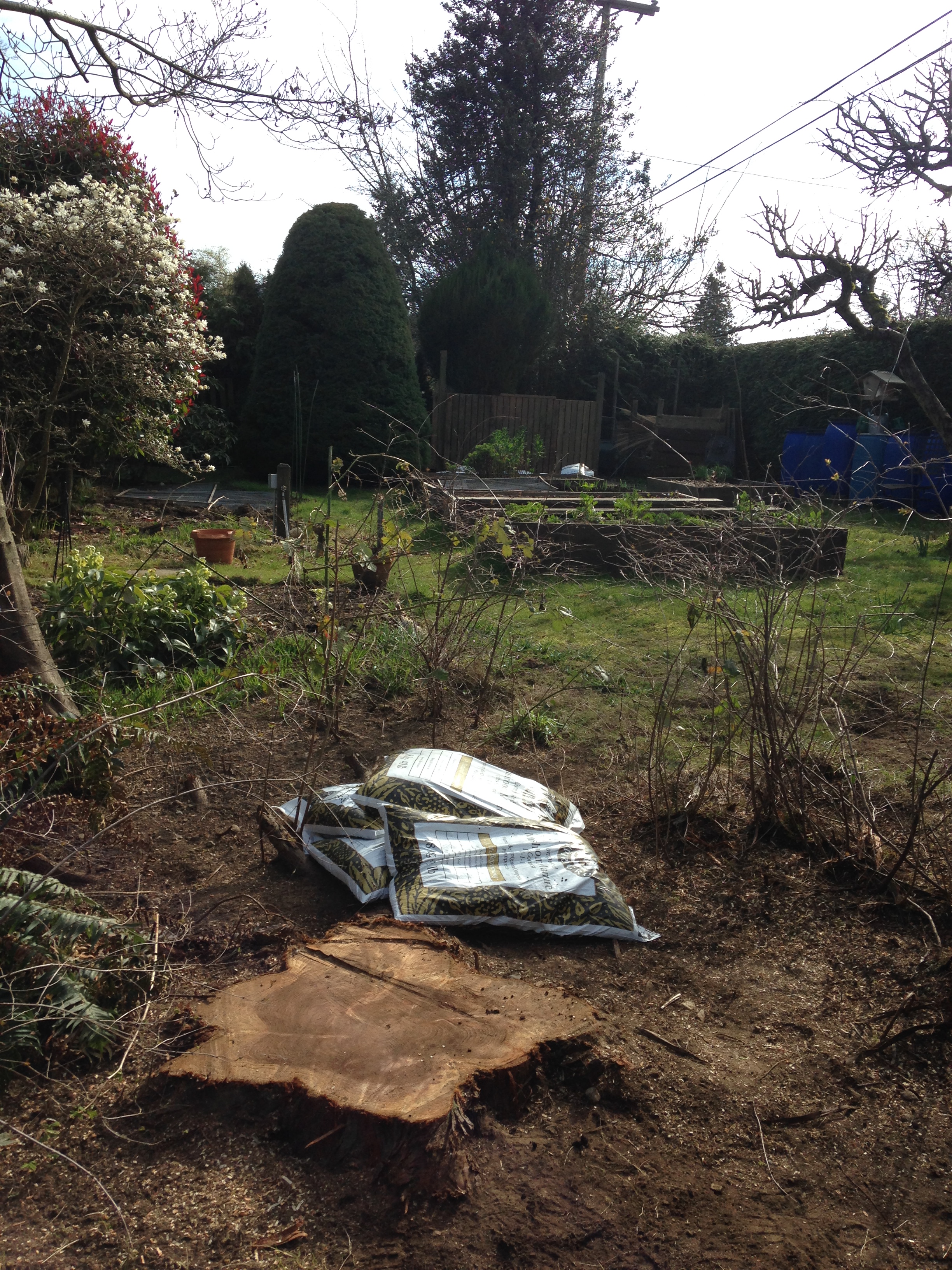Last week we finally had our sick cryptomeria removed so that the rotting branches wouldn’t fall on power lines or people. The tree was between 45-50 years old (based on a ring count), and took up too much space and light in the back. I am thinking that the flat stump will be a great place for the beehive this summer.
