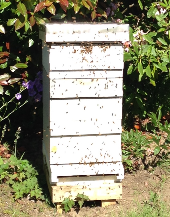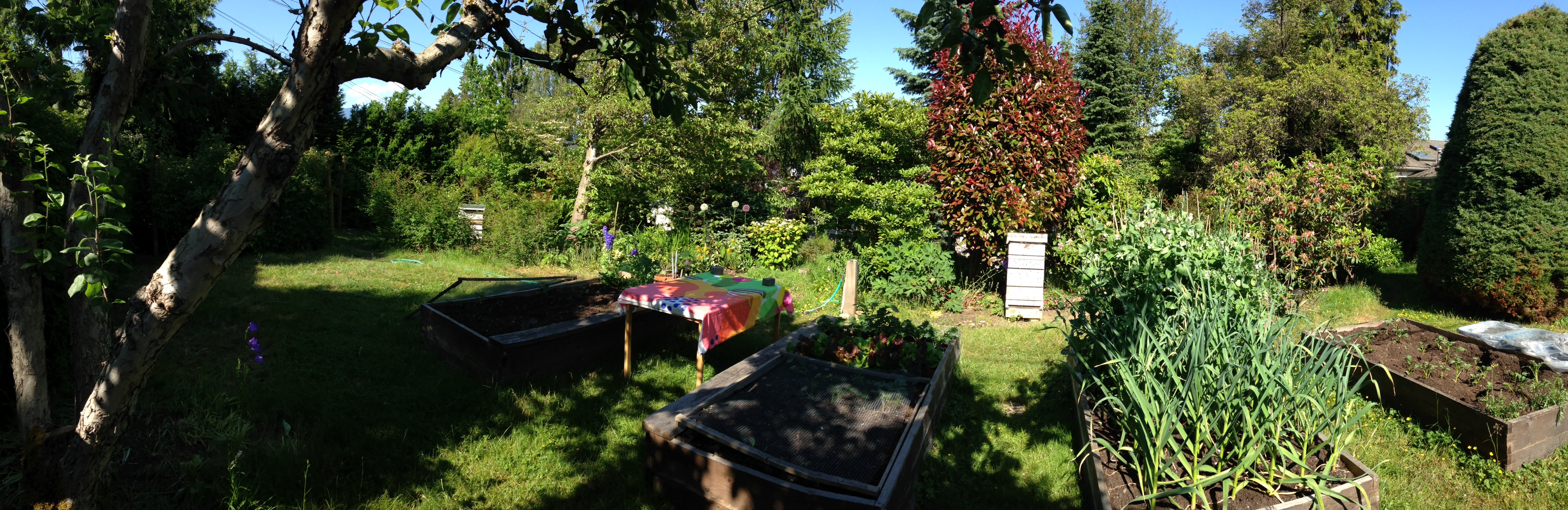 Last weekend Art dropped off a new hive that had been fertilizing Fraser Valley blueberries. This is a SUPER FEISTY hive and every time I walk past it, I get hit by bees and get bees in my hair. Here is a picture of the new hive and a panorama of the back garden showing the relative locations of the hives.