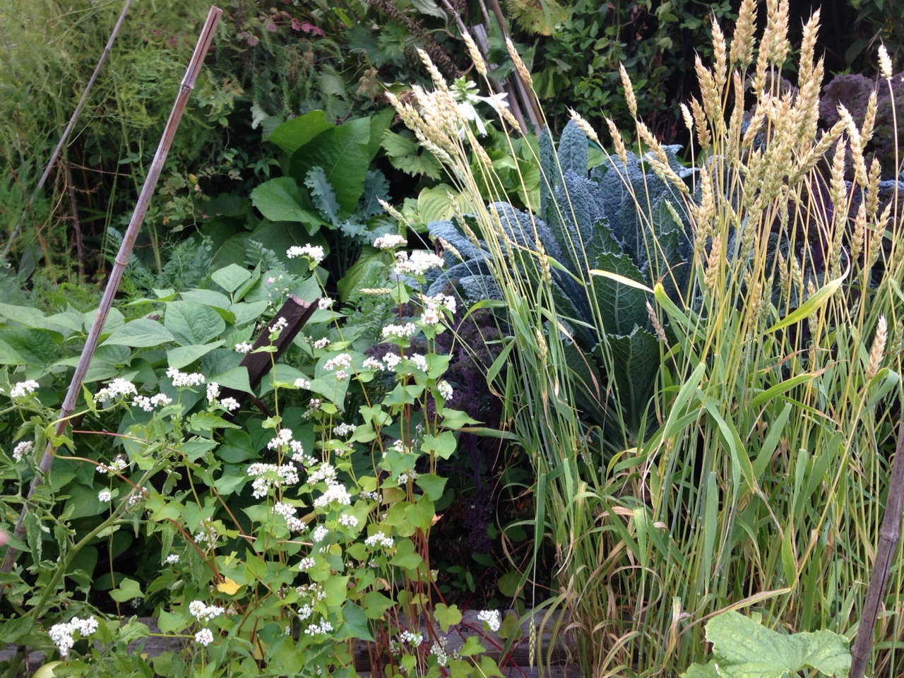 A close up of buckwheat (with the white flowers) and wheat. In the background are her neighbour’s purple beans and kale.