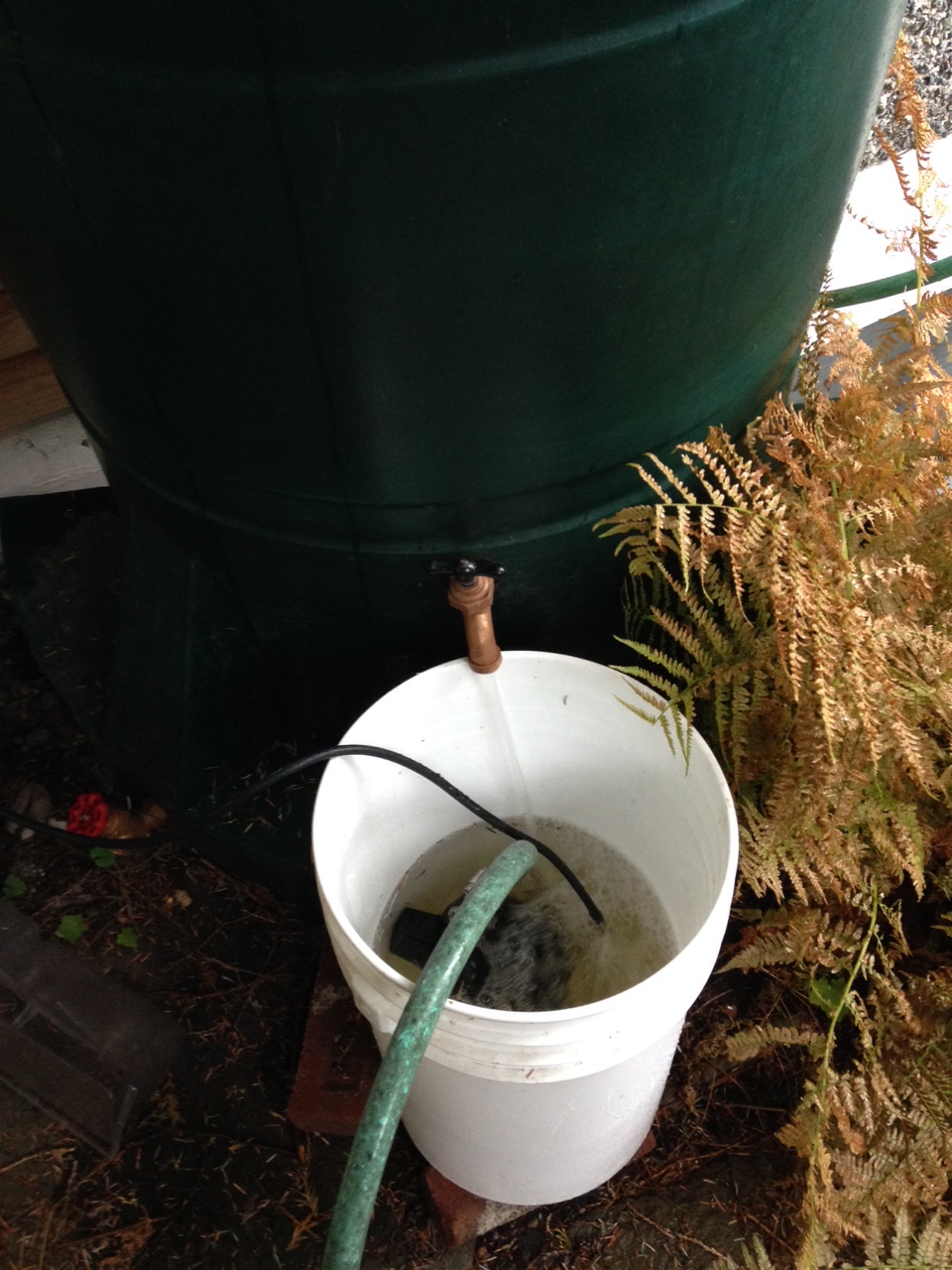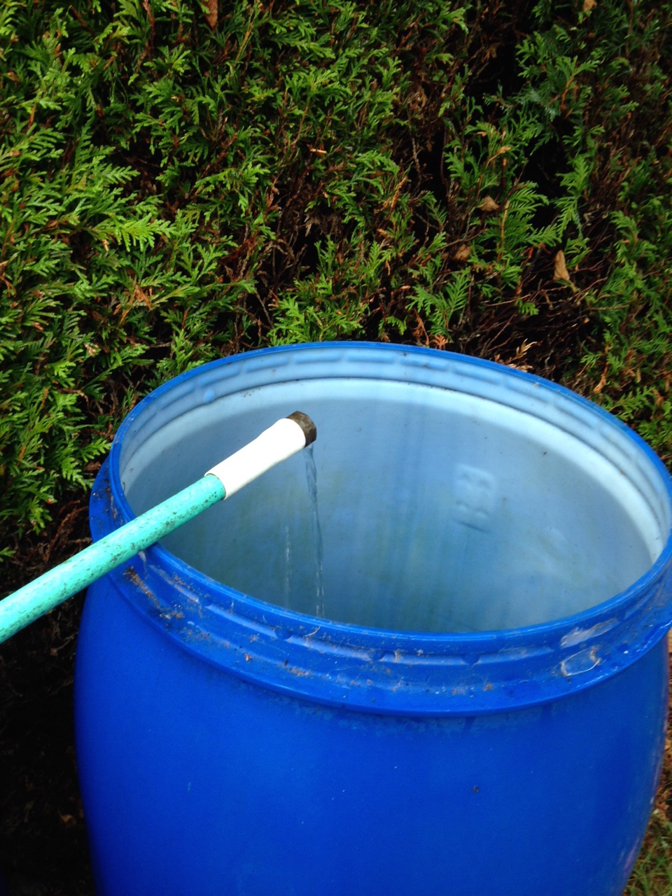 We have a Vancouver rain barrel on the side of our house which fills up fast. In a downpour, up to 25 litres of water a minute pours through the drain spout from the roof, fills the barrel and then the overflow flow through the green hose near the top of the barrel to the drain. When the barrel is full we pump water from the barrel to the top of the garden.