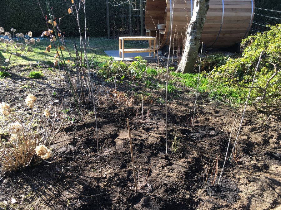 Eight tiny blueberry plants marked with sticks (yes, each plant is only 3 inches tall) with the sauna in the background.